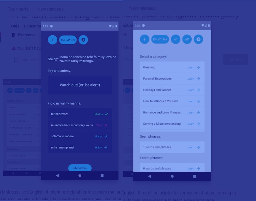 This Malagasy application is built with React Native. It helps people to learn Malagasy and English. Users can see the lists of the available topics that they are going to learn and there is a quiz for them to play around with.